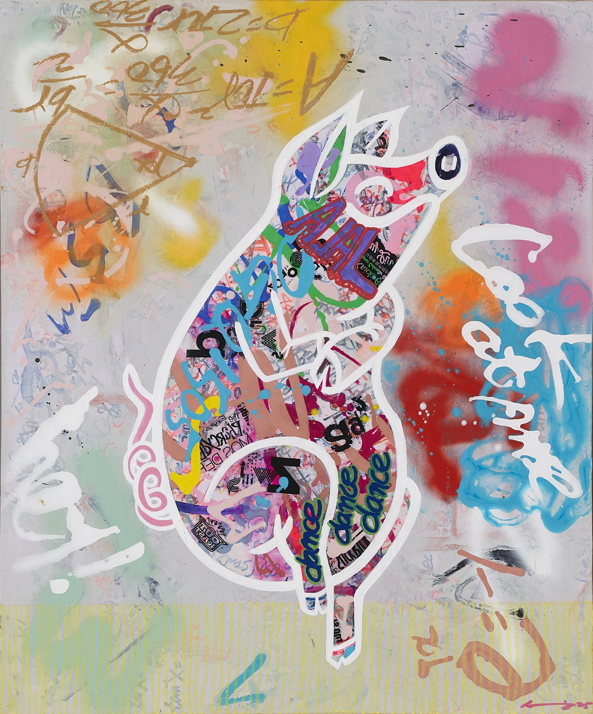서경희, 꿈꾸는 색의 춤사위 캔버스에 아크릴, 오일파스텔, 콜라주, 아크릴 펌프 마커, 스프레이, 72.5x60.5cm, 2024